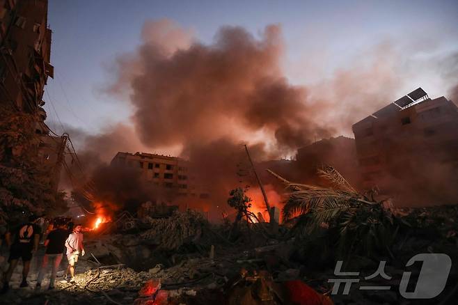 (베이루트 AFP=뉴스1) 우동명 기자 = 28일 (현지시간) 레바논 베이루트의 하레트 흐레이크에서 이스라엘 군의 공습을 받아 불길에 휩싸인 건물서 연기가 솟아 오르고 있다. 2024.09.29