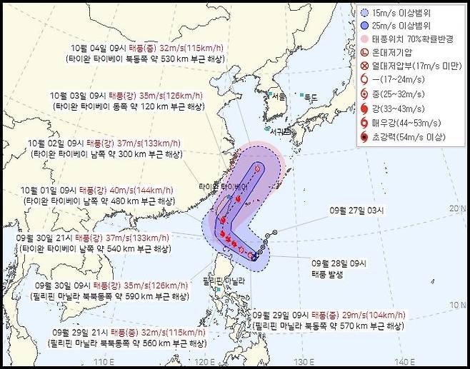 이어 "대만으로 서진을 많이 할 수록 태풍이 약화될 가능성이 있고, 북상 시기가 늦춰질 것"이라며 "반면 2차 기압골을 타면 빠르게 북상할 것"이라고 덧붙였다.