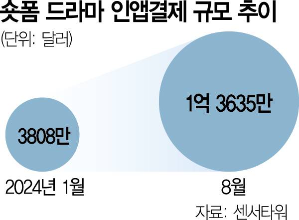 29일 애플리케이션 통계 플랫폼 ‘센서타워’에 따르면 올 8월 기준 글로벌 숏폼 드라마 앱은 72개다. 1월의 46개에서 7개월 만에 26개나 늘었다. 이들 앱에서 콘텐츠를 유료로 결제한 인앱 구매 수익은 1월 3800만 달러(약 497억 원)에서 8월에는 1억 3600만 달러(약 1780억 원)로 세 배 이상 훌쩍 뛰었다.