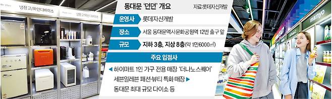 롯데자산개발이 4년간의 대대적 리뉴얼을 거쳐 던던을 연 것은 동대문 상권이 점차 살아나고 있다는 판단에서다. 타깃은 최근 유통 트렌드를 이끌고 있는 ‘외국인 관광객’과 ‘MZ·1인 가구’다. 롯데그룹 관계자는 “동대문구는 동대문디자인플라자(DDP)·을지로 등과 인접해 있어 MZ세대와 외국인 유동인구가 늘고 있고, 1인 가구 비중도 높아 신규 매장 테스트에 적합하다”고 설명했다. 서울시에 따르면 올 1월 기준 동대문구 전체 가구 중 1인 가구 비중은 49.8%(8만6090가구)에 달한다.