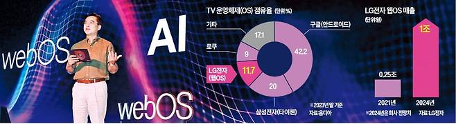 웹OS는 2014년 출시 이후 전 세계 2억 대 넘는 TV에 적용됐다. 올해 매출은 2021년 대비 네 배 증가한 1조원 이상이 될 것으로 LG전자는 예상하고 있다. 세계 TV OS 시장 점유율로 따지면 구글(안드로이드) 42.2%, 삼성전자(타이젠) 20%에 이어 3위(11.7%)다.