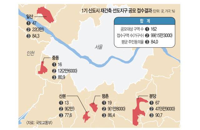 일산 신도시는 47곳 중 강촌마을 백마마을 등 22곳이 신청했다. 3만 가구 수준으로, 기준물량(6000가구)의 5.0배다. 공모신청 구역들의 평균 동의율은 84.3%다. 평촌에서는 19곳 중 은하수 샛별마을 등 9곳이 제안서를 제출했다. 1만8000가구가 공모에 참여했고, 평균 동의율은 86.4%다.