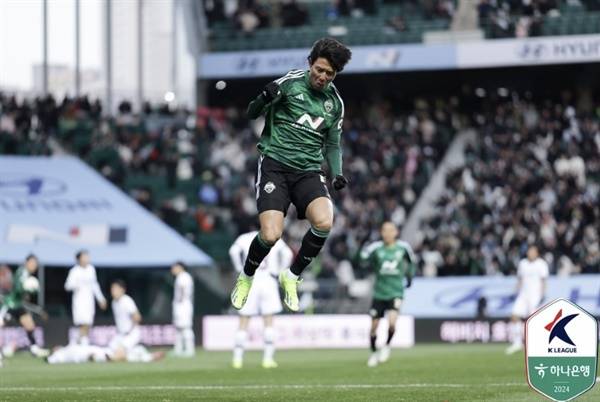 전북은 지난 28일 오후 7시 전주월드컵경기장에서 열린 '하나은행 K리그 1 2024' 32라운드 제주 유나이티드와의 맞대결에서 2-1로 승리를 기록했다. 후반 14분 김진규의 선제골로 앞서가다가 이후 후반 36분에 제주에 페널티킥 득점을 허용하며 위기를 맞았다. 경기 종료 직전, 전진우가 극적인 헤더 역전골을 기록하며 활짝 웃었다.