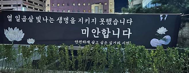 | “못 지켜줘 미안해” 현장에 추모 분향소 전남 순천시 도심에서 일면식도 없는 남성에게 살해된 10대 여성을 추모하는 공간 인근에 고인의 명복을 비는 현수막이 내걸렸다. 26일 밤 조례동 길거리에서 10대 여성이 만취한 30대 남성이 휘두른 흉기에 찔려 숨지자 순천시는 사건 현장에 추모 분향소를 설치했다. 순천=뉴스1 |