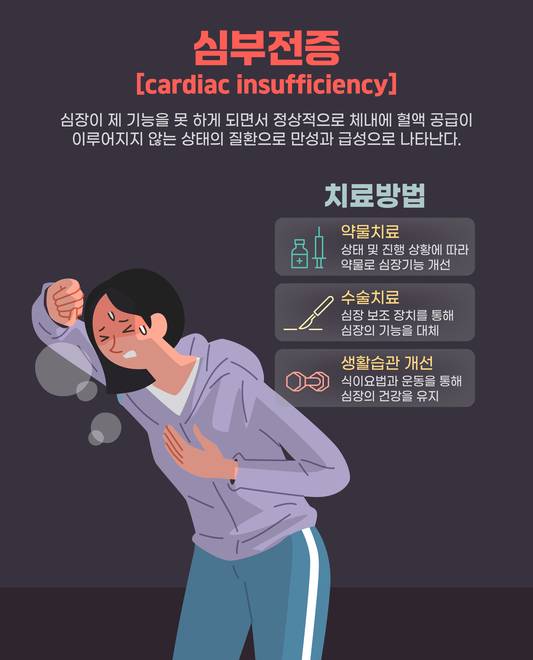 심부전의 원인은 첫째, '반복적인 심근경색'이다. 심근경색은 심장근육으로 혈액을 공급하는 관상동맥이 좁아져 발생한다. 여러 번 겪으면 심장근육이 손상되면서 심장 기능이 떨어진다. 둘째, 심장 근육이 선천적으로 약한 '확장성 심근증'이다. 이 질환이 있으면 나이가 들면서 심장의 기능이 빠르게 떨어질 수 있다. 셋째, 맥박이 갑자기 불규칙해지는 '부정맥'이다. 특히 맥박이 평소보다 2배 가까이 빨라진 부정맥이 지속되면 심장이 지치면서 심부전이 유발될 수 있다. 그 밖에 고혈압, 판막질환, 과도한 음주, 스트레스, 항암 치료 약물 등도 심부전의 원인이 될 수 있다.