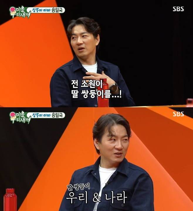 송일국은 아내에게 바라는 두 가지로 애교와 늦둥이 딸을 언급했다. 송일국은 "사실 전 소원이 딸 쌍둥이 낳는 것"이라며 "이름도 지어놨다. 우리·나라"라고 말했다. 그러나 "아내가 세쌍둥이 낳을 때 죽다 살았다"며 "장모님이 그걸 다 지켜보셨지 않나. 장모님이 저한테 '더이상 내 딸한텐 안 되네'라고 하시더라"며 아쉬워했다.