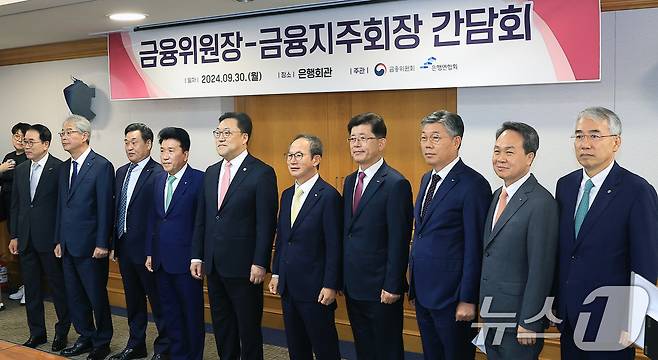 (서울=뉴스1) 박정호 기자 = 30일 오전 서울 중구 은행회관에서 열린 금융위원장과 금융지주회장 간담회에서 조용병 전국은행연합회 회장(왼쪽부터)과 임종룡 우리금융그룹 회장, 김기홍 JB금융지주 회장, 함영주 하나금융지주 회장, 김병환 금융위원장, 양종희 KB금융지주 회장, 빈대인 BNK금융지주 회장, 황병우 DGB금융지주 회장, 진옥동 신한금융지주 회장, 이석준 농협금융지주 회장이 기념 촬영을 하고 있다. 2024.9.30/뉴스1