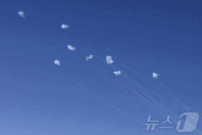 (AFP=뉴스1) 우동명 기자 = 29일 (현지시간) 레바논 남부 접경 지역에서 발사한 로켓이 이스라엘 군 방공망인 아이언 돔에 요격되고 있다. 2024.09.30