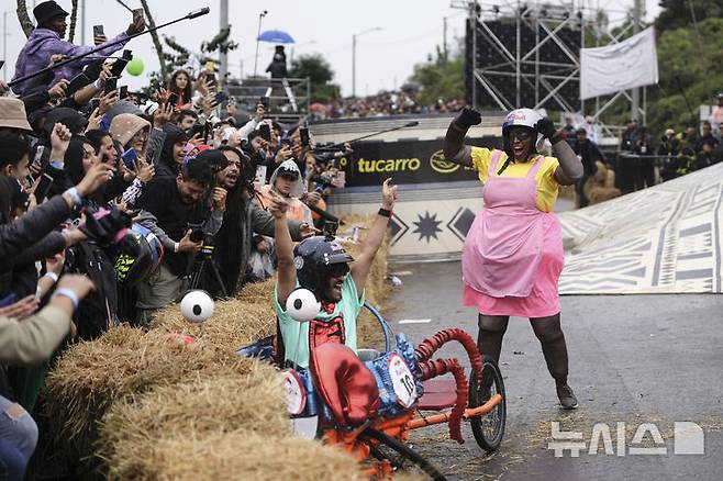 [보고타=AP/뉴시스] 29일(현지시각) 콜롬비아 보고타에서 무동력 차량 경주가 열려 직접 만든 차량으로 경주로를 달리던 참가자들이 방호벽에 부딪힌 후 관객들의 환호를 이끌어내고 있다. 이 경주는 참가자들이 창의력과 기술력으로 중력만을 이용해 구동하는 차량을 만들어 경쟁하는 독특한 행사로, 현지 주민과 방문객들에게 큰 즐거움을 선사하는 행사로 자리 잡고 있다. 2024.09.30.