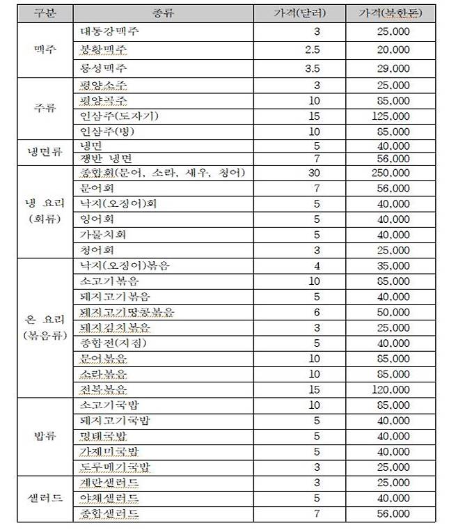 위 표는 평양시 중구역에 있는 합의제식당(2016년기준)의 판매 품목과 가격(달러)을 알 수 있다. 이 식당은 200평 규모로 요리사는 7명, 접대원은 3명으로 총 10명의 종업원으로 구성되어 있다. 개인 식당에서 가장 중요한 것은 요리사의 맛을 내는 음식이고, 접대원의 미모가 수입과 집결되기 때문에 두 가지가 필수조건이라고 할 수 있다. 특히 접대원은 미모가 뛰어나고 키가 165㎝ 이상으로 머리부터 발끝까지 잘 차려입은 대외 봉사전문학교를 졸업한 20대 여성을 선호한다. 요리가 나오는 순서는 술이 먼저 나오고, 냉 요리, 온 요리, 식사류, 마지막으로 디저트로 샐러드가 나온다.