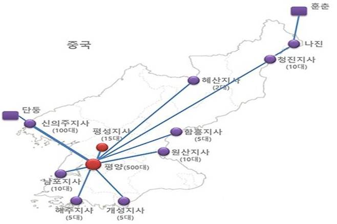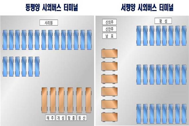 북한에서는 일반적으로 철도교통을 주로 이용하고 있었지만 전기 사정이 나빠지면서 기차가 지연·연착되면서 도로교통이 발달하게 되었다. 도로교통은 주로 평양과 평성을 중심으로 사람과 물품을 각 지방으로 이동시킨다. 평양 시외버스 터미널은 두 개가 있다. 하나는 동평양 시외버스 터미널로 락랑구역 토성시장에 위치해 있는데 사리원(4대), 해주(4대), 개성(4대), 함흥(4대), 원산(10대), 혜산(2대), 청진(2대)으로 버스가 운행된다. 또 다른 하나인 서평양 시외버스 터미널은 서성구역 연못동, 3대혁명전시관 앞에서 평성(30대), 남포(10대), 신안주(4대), 신의주(4대)로 버스가 운행하고 있다. 이러한 버스는 국가 버스사업소 명의를 빌려 사실은 각 돈주들이 버스 한 대씩을 투자하여 운행하고 있어서 버스의 운행이 민간 차원에서 이루어진 셈이다.