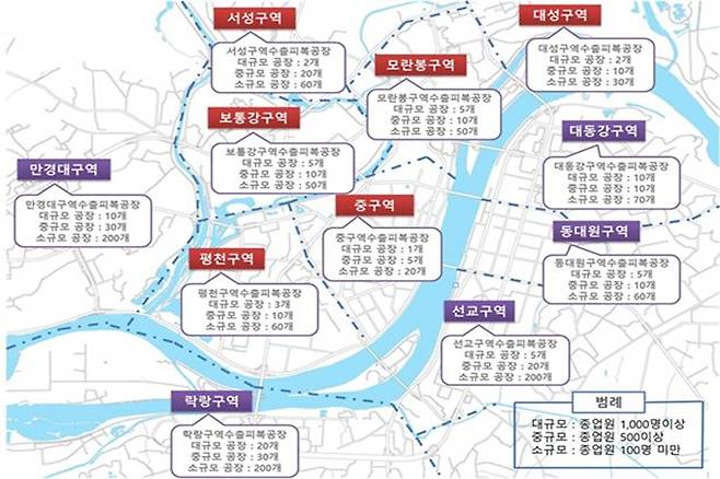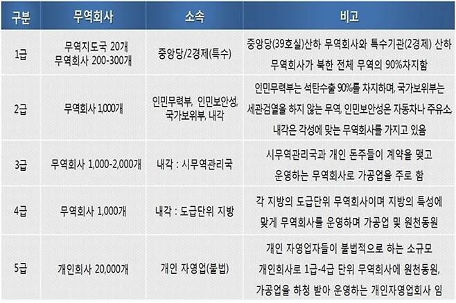 북한에서 무역회사의 종류 1급은 대기업에 해당되고, 2급은 중견기업, 3~5급은 중소기업에 해당된다. 1급 규모의 무역회사는 200~300개가 있으며, 90%가 중앙당 산하의 무역회사이다. 2급 규모의 무역회사는 1000개 정도 있는 것으로 조사되었으며, 인민무력부, 인민보안성, 국가보위부, 내각 소속에 무역회사가 많다. 3급은 내각 시무역관리국소속으로 1000~2000개가 있으며, 4급은 내각 도급 단위 지방 소속으로 1000개로 추정된다. 5급은 개인자영업 형식으로 아직은 합법적인 것은 아니지만 개인회사로 2만개 정도 있는 것으로 추산된다.