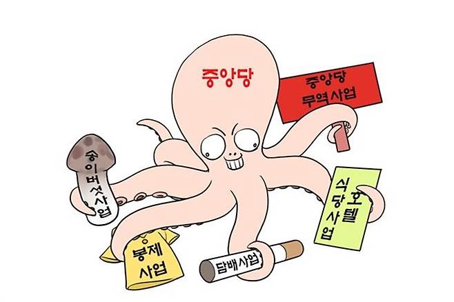 특히 중앙당은 그림에서 보듯이 특권 권력을 이용하여 문어발식 기업을 운영하고 있다. 먼저, 북한 송이버섯을 독점으로 수출을 하고 있다, 둘째, 평양시 봉제공장(25만명) 및 해외 봉제공장을 관리 감독한다. 셋째, 크라빈이라는 담배를 생산 및 판매에도 독점권을 가지고 있어서 막대한 수익을 창출하고 있다. 크라빈 담배는 주로 선물용(뇌물)으로 사용하고 있으며, 중독성이 강하여 한 번 피운 사람은 반드시 다시 찾게 된다고 한다. 넷째, 평양시 고려호텔, 양각도호텔과 대규모 식당도 운영하고 있다. 마지막으로 중앙당 산하 무역회사로서 광물(금, 은, 구리, 광석, 희토류)을 독점하고 있다.