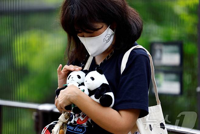 (도쿄 로이터=뉴스1) 권진영 기자 = 28일 일본 도쿄 우에노 동물원에서 한 방문객이 중국으로 돌아가는 자이언트 판다 '신신'과 '리리'의 인형을 쓰다듬고 있다. 2024.09.28/
