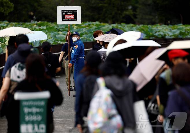 (도쿄 로이터=뉴스1) 권진영 기자 = 28일 일본 도쿄 우에노 동물원이 중국으로 돌아가는 자이언트 판다 '신신'과 '리리'를 보기 위해 모인 관람객으로 북적이고 있다. 한 경비원이 줄 끝열을 알리는 표지판을 들고 서 있다. 2024.09.28/