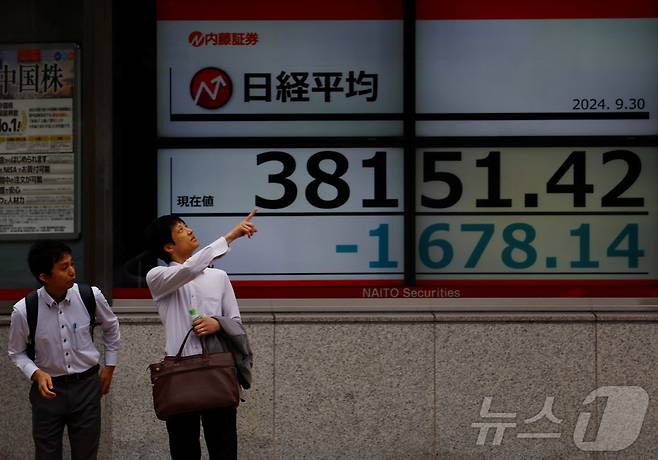 (도쿄 로이터=뉴스1) 김지완 기자 = 30일 일본 도쿄 도심에서 닛케이지수가 표시된 전광판 앞에서 시민들이 대화하고 있다. 2024.09.30