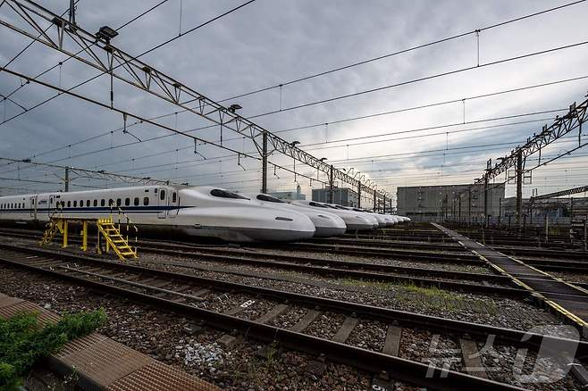 (도쿄 AFP=뉴스1) 김지완 기자 = 지난 7월 24일 일본 도쿄 시나가와구 신칸센 차량기지의 신칸센 N700A와 N700S계 열차 모습. 오는 10월 1일은 일본 고속열차 신칸센이 도입된 지 60주년이 되는 날이다. 2024.07.24