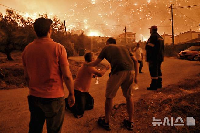 [아노 루트로=AP/뉴시스] 29일(현지시각) 그리스 수도 아테네에서 약 131㎞ 떨어진 코린티아주 아노 루트로 마을 주민들이 강풍에 확산하는 산불을 지켜보고 있다. 현지 경찰은 이 화재로 지금까지 2명이 숨진 채 발견됐다고 밝혔다. 2024.09.30.