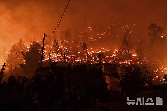 [칼리테아=AP/뉴시스] 29일(현지시각) 그리스 수도 아테네에서 약 149㎞ 떨어진 코린티아주 칼리테아 마을 인근 숲이 강풍에 확산한 산불로 타고 있다. 현지 경찰은 이 화재로 지금까지 2명이 숨진 채 발견됐다고 밝혔다. 2024.09.30.
