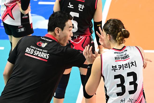 반면 정관장의 외국인 선수 반야 부키리치(세르비아)와 아시아쿼터 메가왓티 퍼티위(등록명 메가, 인도네시아)를 함께 가동하는 ‘쌍포 전략’은 큰 문제가 없었다. 아웃사이드 히터로 나서 리시브를 받은 부키리치도 198cm의 큰 신장에도 불구하고 그리 큰 흠결은 없었다. 세터 머리 위로 정확하게 연결하는 확률은 다소 떨어졌지만, 상대 서브에 에이스를 허용하는 모습은 나오지 않았다. 부키리치가 31점(공격 성공률 39.71%)로 팀 내 최다득점을 기록한 가운데, 메가도 22점(35.29%)을 올리며 정관장 공격을 부키리치와 함께 이끌었다.