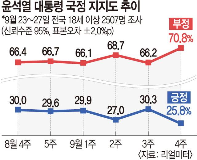 리얼미터가 지난 23~27일 전국 18세 이상 유권자 2507명을 조사한 결과 윤 대통령의 국정 수행을 긍정 평가한 비중은 25.8%로 취임 이후 최저치였다.