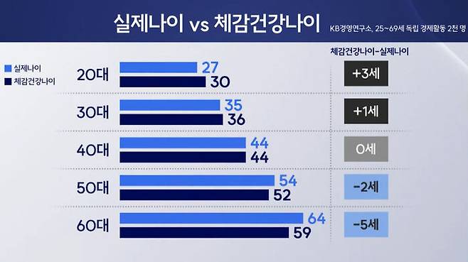 각자가 느끼는 건강나이, 어떤 컨디션으로 살고 있는지, 여기에 대한 감각은 연령대에 따라서 뚜렷하게 갈렸습니다. 40대가 기준점입니다. 30대까지는 자기 실제 나이보다 체감 나이가 보통 더 많았습니다. 한 마디로 젊은이들이 오히려 실제 나이보다 본인 건강 상태가 좋지 못하다고 느끼는 경향이 컸단 겁니다.