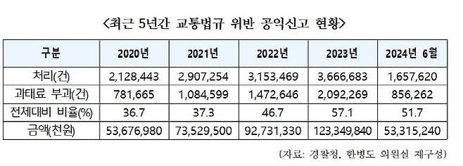1일 국회 행정안전위원회 소속 더불어민주당 한병도 의원(전북 익산시 을)이 경찰청으로부터 제출받은 국정감사 자료에 따르면 경찰청이 처리한 교통법규 위반 공익신고는 2020년 212만 8443건, 2021년 290만 7254건, 2022년 315만 3469건, 2023년 366만 6683건으로 매년 급증세를 보이고 있는 것으로 확인됐다.