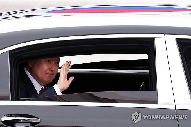 (성남=연합뉴스) 홍해인 기자 = 윤석열 대통령이 1일 성남 서울공항에서 열린 건군 76주년 국군의날 기념식을 마치고 떠나며 손을 들어 인사하고 있다. 2024.10.1 [대통령실통신사진기자단]