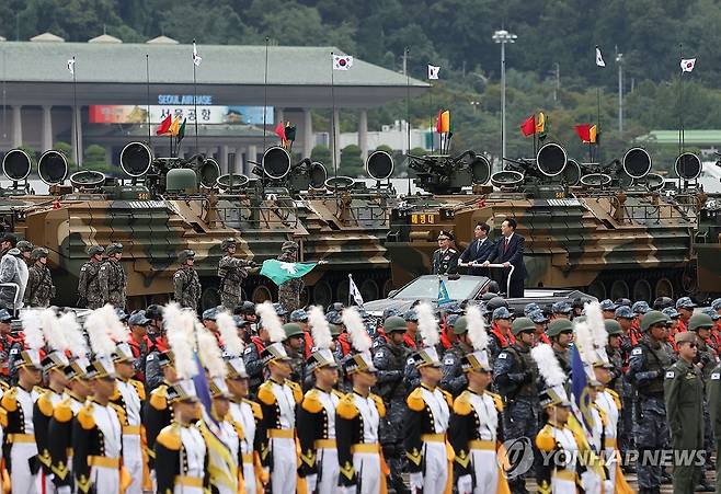 (성남=연합뉴스) 홍해인 기자 = 윤석열 대통령이 1일 성남 서울공항에서 열린 건군 76주년 국군의날 기념식에서 국군 부대를 사열하고 있다. 2024.10.1 [대통령실통신사진기자단]