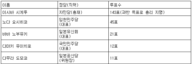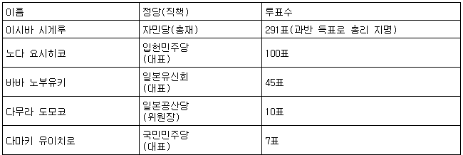 [표] 일본 중·참의원 이시바 시게루 제102대 총리 선출 결과