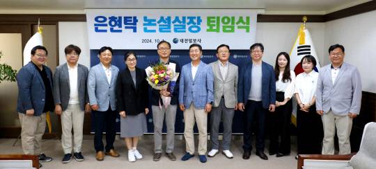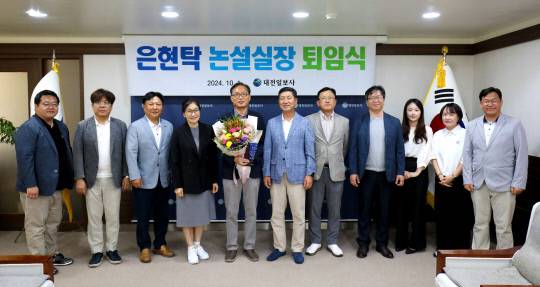 대전일보는 1일 본사 사옥에서 은현탁(왼쪽 다섯번째) 논설실장의 정년퇴임식을 가졌다. 은 실장은 1991년 대전일보에 입사해 편집부, 서울지사 정치부, 사회부, 경제부 등을 거쳐 기획조정실장, 세종취재본부장, 충남취재본부장 등을 역임했다. 이날 정년퇴임식에 참석한 임직원들이 기념촬영을 하고 있다.