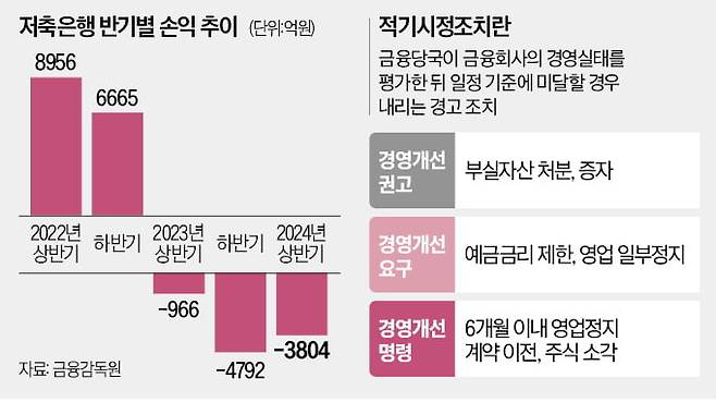 금감원은 지난 6월 부실 우려 저축은행 세 곳을 대상으로 실시한 경영실태평가 등급을 확정하고 최근 금융위원회에 의견서를 전달했다. 저축은행 3개사 모두 자산 건전성 4등급(취약)을 받아 적기시정조치 대상이 됐다. 적기시정조치는 금융당국이 금융회사의 경영 실태를 종합적으로 평가한 뒤 일정 기준에 미달할 경우 부과하는 구조조정 절차다. 금융당국은 경영개선권고를 받은 저축은행에 △인력 및 조직 운영 개선 △부실 자산 처분 △자본금 증액 △배당 제한 등 조치를 이행하도록 지시할 수 있다.
