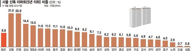 서울 아파트 가운데 준공 5년 이하 신축 비중이 10%에도 못 미치는 것으로 조사됐다.