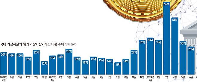 가상자산 분석업체 체이널리시스에 따르면 2022년 7월부터 지난 6월까지 2년간 국내 거래소에서 해외 거래소로 이동한 가상자산 규모는 553억달러(72조6000억원)에 달한다. 올해 6개월간만 해도 235억달러(30조8000억원)가 해외 거래소로 빠져나갔다.