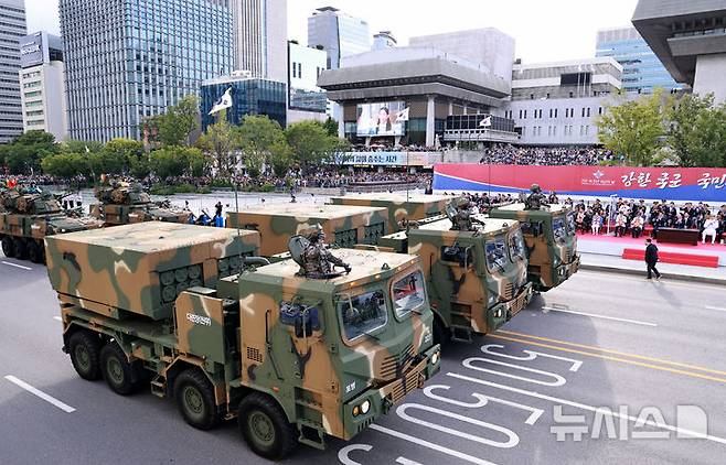 [서울=뉴시스] 최진석 기자 = 윤석열 대통령이 1일 서울 광화문 일대에서 열린 건군 76주년 국군의날 시가행진 세종대왕상 앞 관람 무대에서 다련장 로켓 천무를 바라보고 있다. (대통령실통신사진기자단) 2024.10.01. myjs@newsis.com
