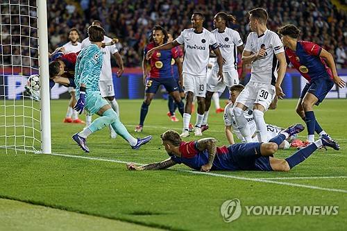 Barcelona's Robert Lewandowski, left, scores his side's fourth goal during the Champions League soccer match between Barcelona and Young Boys at the Lluis Companys Olympic Stadium in Barcelona, Spain, Tuesday, Oct. 1, 2024. (AP Photo/Joan Monfort)