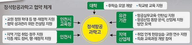 정석항공과학고와 ‘한 팀’을 이룰 협약 체계에는 △인천시 △인천시교육청 △산업체 4곳(한국공항(주), (주)샤프에비에이션케이, (주)샤프테크닉스케이, (주)STX에어로서비스) △유관기관 3곳(항공우주산학융합원, 인천지역인적자원개발위원회, 인천테크노파크) △대학 3곳(인하대, 인하공업전문대, 한국폴리텍대학 남인천캠퍼스)이 이름을 올렸다. 이들은 지산학 연계를 통해 현장실습, 교원 연수 등을 강화하고 차별화된 교육과정 모델 개발에 함께 나선다는 방침이다.