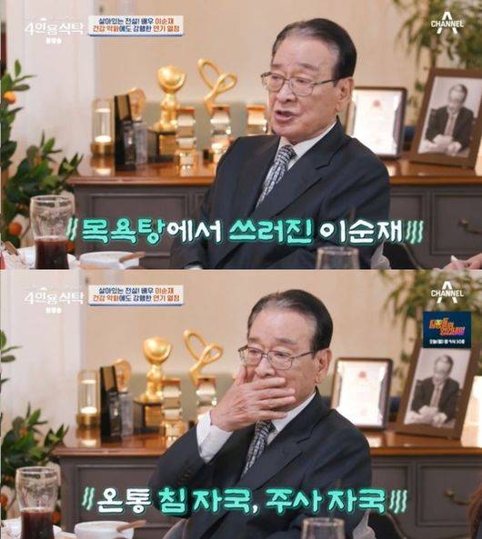 이순재는 지난 7월 방송된 채널A '4인용 식탁'에서도 건강 이상으로 아찔했던 순간을 전했던 바 있다. 작년 한해동안 네 작품을 하면서 체중이 10kg이나 빠져 목욕탕에서 쓰러졌던 것. 그는 "내 인생이 끝나는 줄 알았다. 병원 응급실에 갔더니 머리는 괜찮다고 하더라"라고 털어놨다. 하지만 그로부터 한달도 되지않아 드라마를 찍었고, 결국 눈이 나빠져 백내장 수술까지 했지만 수술후 시력 회복이 덜 된 상황에서도 제작사 사정을 고려해 촬영을 마무리 했다고 밝히기도 했다.