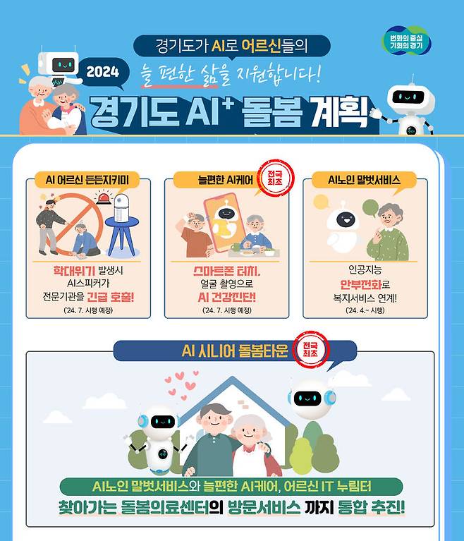 도는 지난 5월 노인돌봄 정책 방향을 대면 사후관리 중심에서 AI를 활용한 비대면 예방 관리체계로 전환하는 내용을 담은 '경기노인 AI+돌봄' 추진계획을 발표하고 ▲늘편한 AI케어 ▲AI 어르신 든든지키미 ▲AI 노인말벗서비스 ▲AI 시니어 돌봄타운 등 4개 정책을 추진하고 있다.