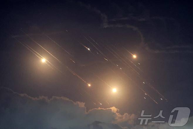 (예루살렘 AFP=뉴스1) 우동명 기자 = 1일(현지시간) 이스라엘 예루살렘 상공에서 하마스 수장 이스마일 하니예, 헤즈볼라 수장 하산 나스랄라 등의 암살에 대한 보복으로 이란에서 발사한 미사일이 이스라엘 방공망 아이언돔에 요격되고 있다. 2024.10.02