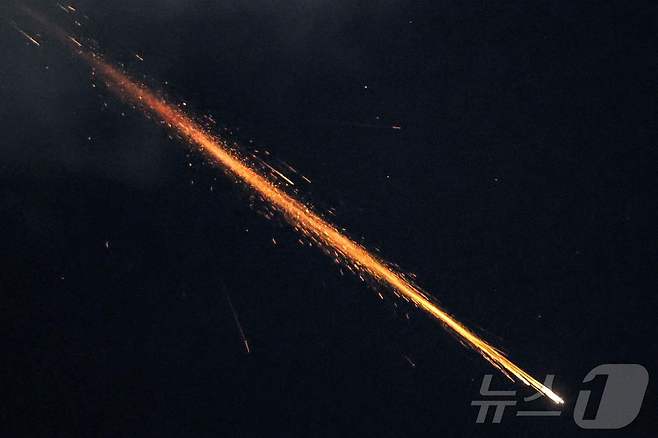 (예루살렘 AFP=뉴스1) 우동명 기자 = 1일(현지시간) 이스라엘 예루살렘 상공에서 하마스 수장 이스마일 하니예, 헤즈볼라 수장 하산 나스랄라 등의 암살에 대한 보복으로 이란에서 발사한 미사일이 이스라엘 방공망 아이언 돔에 요격되고 있다. 2024.10.02