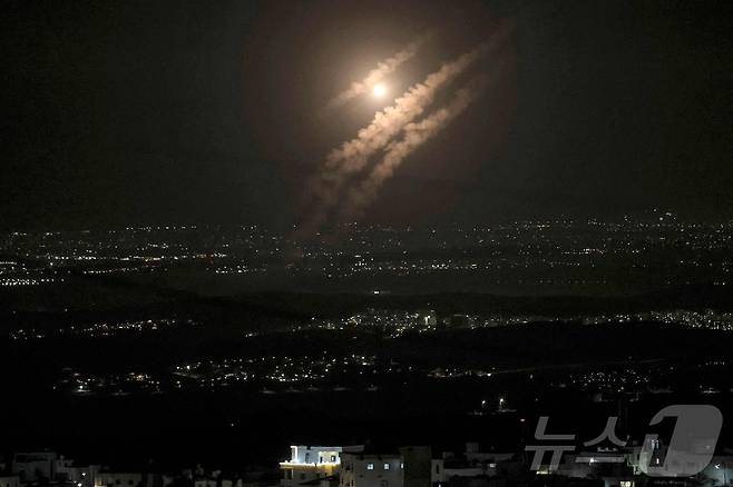 (헤브론 AFP=뉴스1) 우동명 기자 = 1일(현지시간) 이스라엘 아시도드 상공에서 하마스 수장 이스마일 하니예, 헤즈볼라 수장 하산 나스랄라 등의 암살에 대한 보복으로 이란에서 발사한 미사일이 요르단 서안도시 헤브론에서 보이고 있다. 2024.10.02