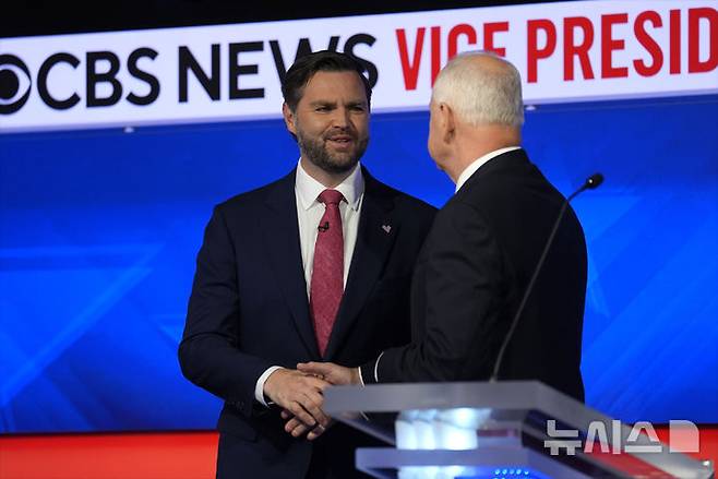 [뉴욕=AP/뉴시스] 미국 공화당 부통령 후보 JD 밴스(왼쪽) 상원의원과 민주당 부통령 후보 팀 월즈 미네소타 주지사가 1일(현지시각) 뉴욕의 CBS 방송센터에서 열린 부통령 후보 TV 토론 시작 전 악수하며 인사하고 있다. 2024.10.02.