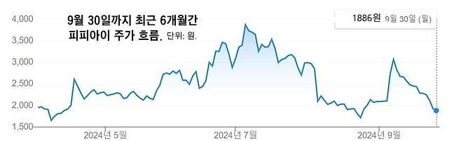 신주 발행 예정 가격은 1370원으로, 유상증자 발표 전날 종가(2280원) 대비로는 40% 낮은 가격이다. 유상증자를 하면 주식 수가 늘어나 가치가 희석되기 때문에 대체로 악재로 인식된다. 피피아이 주가는 26~27일 이틀간 14% 떨어진 데 이어 30일에도 2% 하락해 1886원으로 마감했다. 30일 종가 기준 시총은 186억 원 수준으로 줄었다.