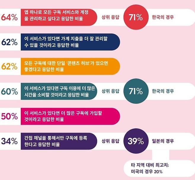 실제로 조사에 참여한 동아시아 국가 소비자의 64%가 모든 구독과 계정을 관리할 수 있는 서비스의 필요성을 느끼는 것으로 나타났다. 특히 한국 소비자의 71%가 구독 서비스를 통합적으로 관리할 수 있는 서비스를 원한다고 답했다. 이는 대만(66%), 일본(56%)과 비교해 가장 높은 수치다.