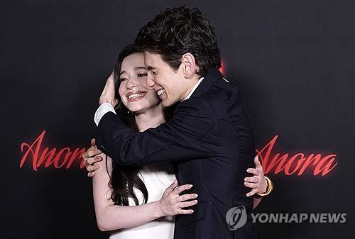 Mikey Madison, left, and Mark Eydelshteyn, cast members in "Anora," embrace at the premiere of the film, Tuesday, Oct. 1, 2024, at the Vista Theatre in Los Angeles. (AP Photo/ Chris Pizzello) 100124130877, 21334631,