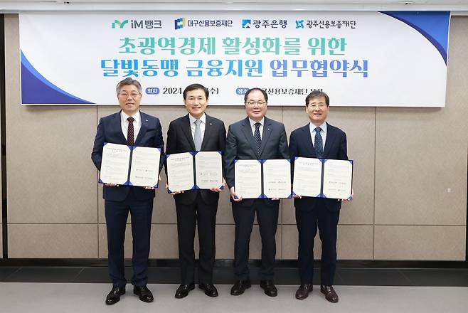 iM뱅크(아이엠뱅크, 은행장 황병우)는 2일 대구신용보증재단 본점에서 대구신용보증재단(이사장 박진우), 광주은행(은행장 고병일), 광주신용보증재단(이사장 김귀남)과 영호남 초광역경제 활성화를 위한 '달빛동맹 금융지원 업무협약'을 체결했다고 밝혔다.