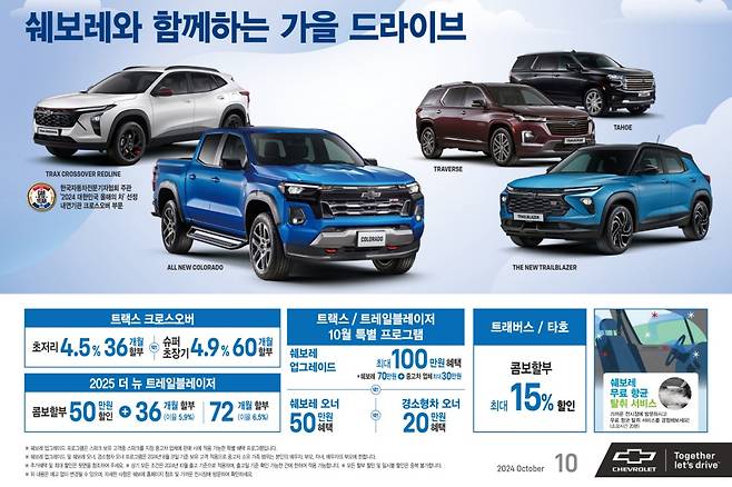 GM한국사업장은 ‘쉐보레와 함께하는 가을 드라이브’ 프로모션을 진행하며 국내 소비자들에게 풍성한 혜택을 제공한다. 먼저, 트랙스 크로스오버를 구매자에게 4.5% 이율로 최대 36개월, 4.9%의 이율로 최대 60개월 할부 혜택을 제공한다.