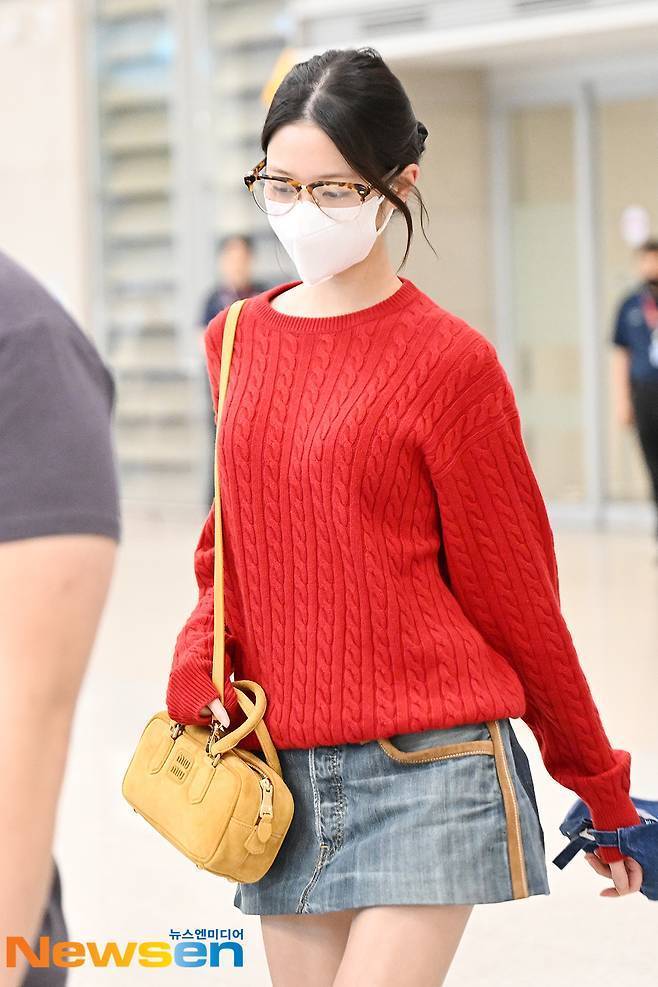 이날 장원영은 강렬한 레드 니트에 청치마 코디로 가을 무드를 완벽하게 보여줬다.