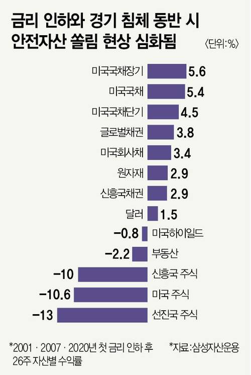 이 같은 시장 반응은 과거 사례를 보면 이해할 수 있다. 그동안 경기 침체를 동반한 금리 인하는 안전자산으로 쏠림 현상을 심화했다. 삼성자산운용 리서치센터가 1990년 이후 5차례(1990·1995·2001·2007·2019년) 있었던 미국 금리 인하 시기 자산별 수익률(첫 금리 인하 후 26주)을 분석한 결과다. 해당 분석에 따르면 경기 침체로 인해 금리를 내린 시기에는 안전자산으로 꼽히는 미국 장·단기채나 달러 등이 ‘플러스(+)’ 수익률을 기록했다. 반면, 위험자산인 선진국·신흥국 주식은 ‘마이너스(-)’ 수익률을 기록했다. 빅컷으로 금리 인하를 시작한 2001·2007년의 경우 이후 2~3개월 뒤 침체 국면에 진입했다.
